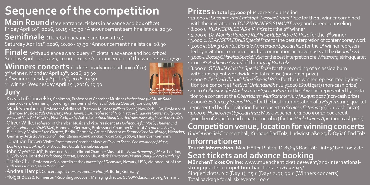 Karten: MünchenTicket: https://www.muenchenticket.de/event/2nd-international-string-quartet-competition-bad-toelz-2026-32034/. Tourist-Info Bad Tölz: Am Schalter während der Öffnungszeiten (Mo-Fr 9-18, Sa 9-12:30) oder telefonisch unter 08041-7867-0 oder per Mai an n.stadler@bad-toelz.de