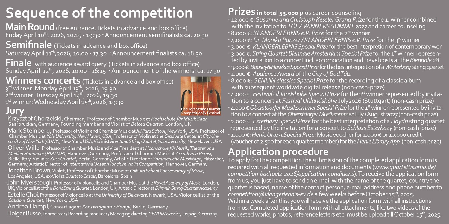 Karten: MünchenTicket: https://www.muenchenticket.de/event/2nd-international-string-quartet-competition-bad-toelz-2026-32034/. Tourist-Info Bad Tölz: Am Schalter während der Öffnungszeiten (Mo-Fr 9-18, Sa 9-12:30) oder telefonisch unter 08041-7867-0 oder per Mai an n.stadler@bad-toelz.de