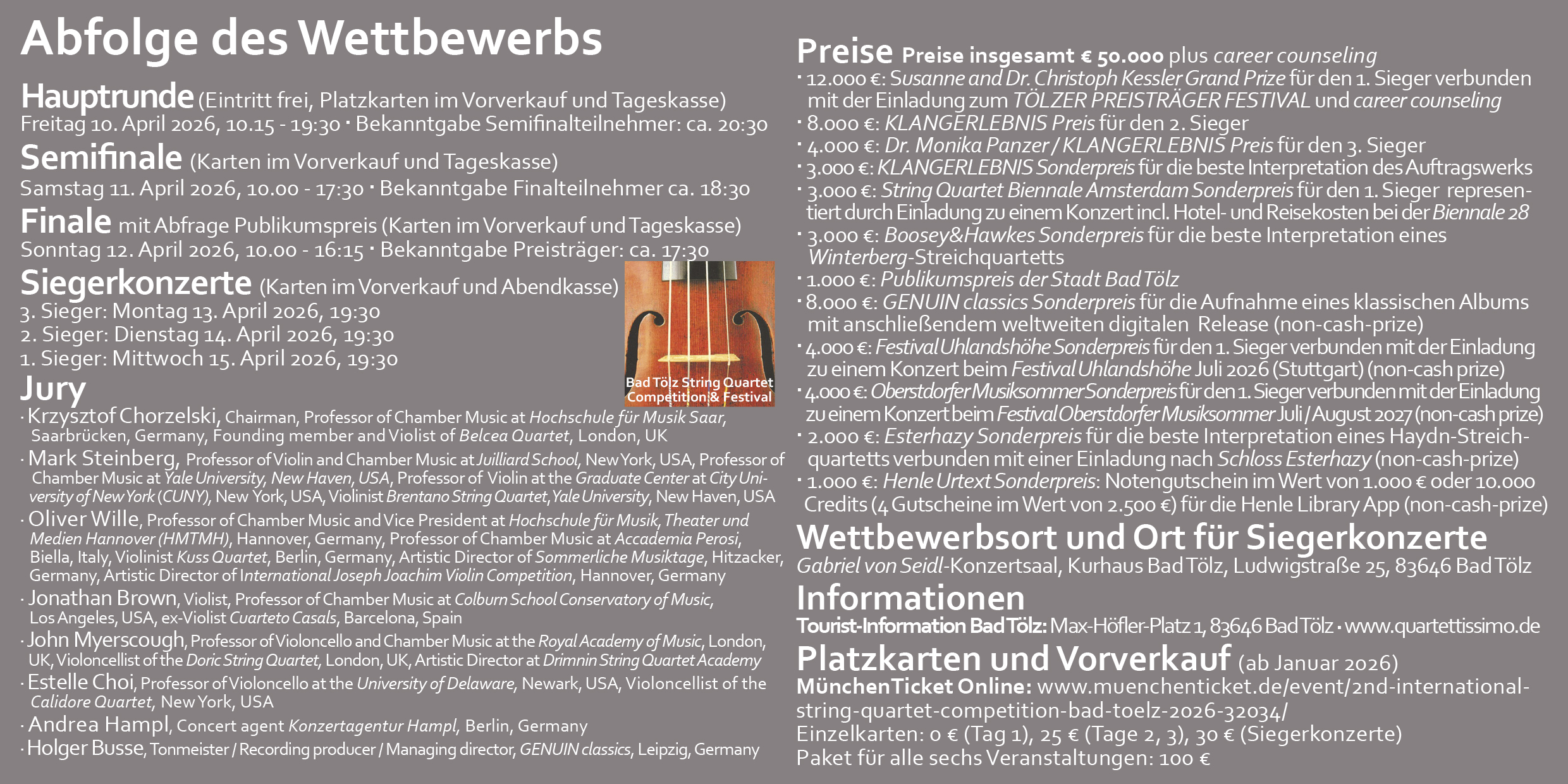 Karten: MünchenTicket: https://www.muenchenticket.de/event/2nd-international-string-quartet-competition-bad-toelz-2026-32034/. Tourist-Info Bad Tölz: Am Schalter während der Öffnungszeiten (Mo-Fr 9-18, Sa 9-12:30) oder telefonisch unter 08041-7867-0 oder per Mai an n.stadler@bad-toelz.de